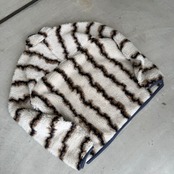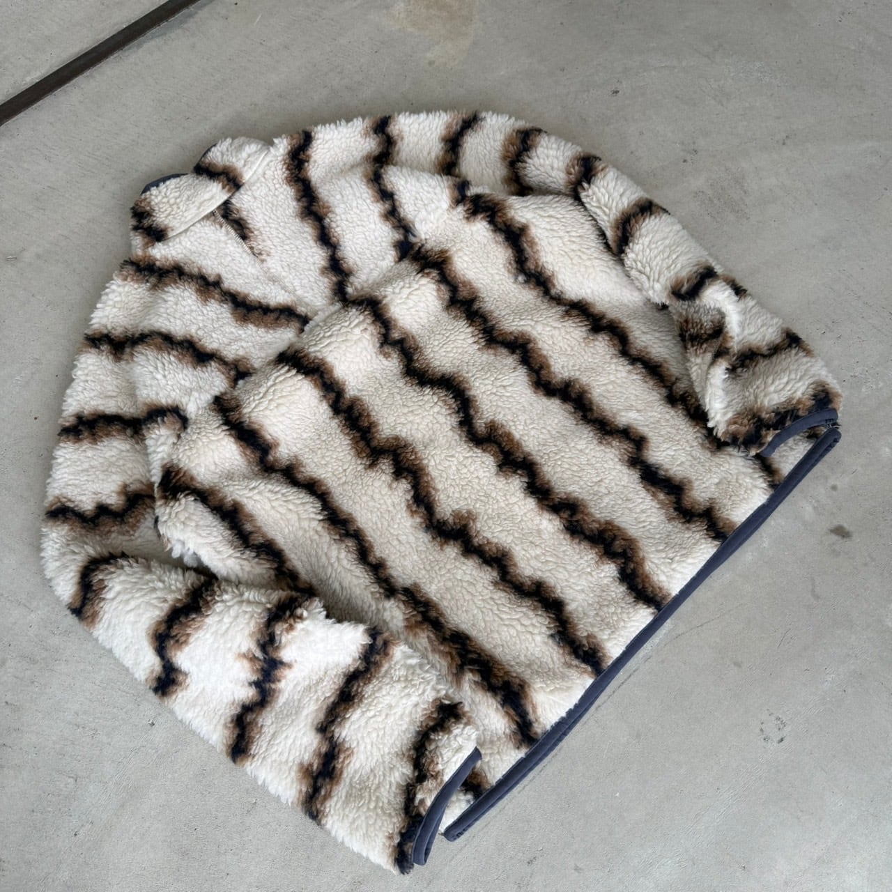 ポリエステル77%にウール23%をブレンドした独自のフリース素材が採用されています。ウールをブレンドすることで、化繊フリース特有の光沢感を抑え、より天然素材に近い、奥行きのあるテクスチャーを実現しています。ウール本来の優れた保温性と、耐久性の高いポリエステルの良さが活かされており、見た目の暖かさと着心地の良さを両立した意欲作です。